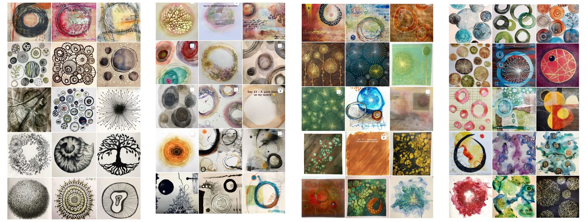 I think I got up to 70 something, so I didn’t actually reach 100, yet I still got so much from doing 70 pages of circles of some kind. The process allowed my confidence and belief to grow, that I still had my creativity after all these years of working as a hairstylist and running a business. My creative urges waited patiently in the background, simmering away patiently, waiting for the right time to rise up and be revived.